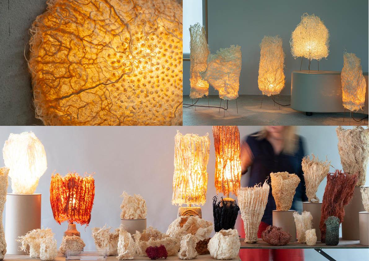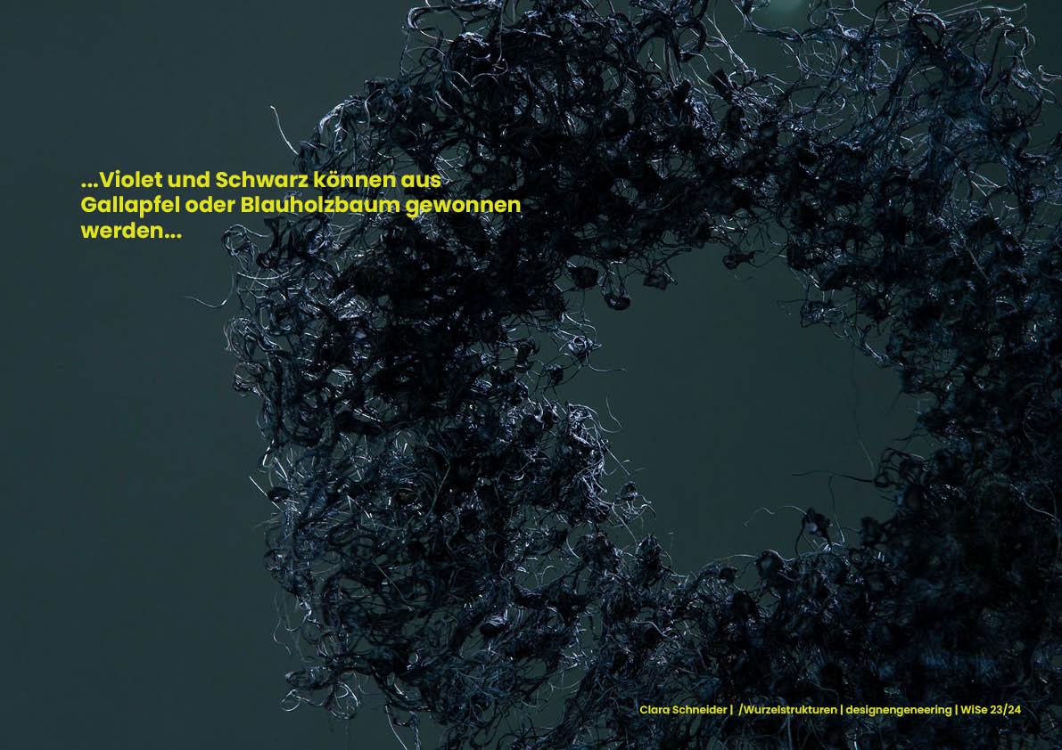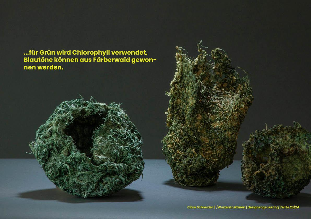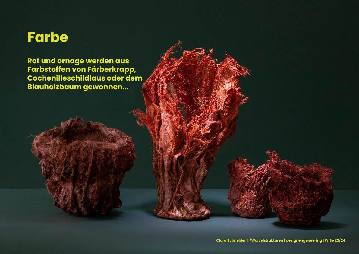Nach der Ernte muss die Struktur 24h trocknen und übrig bleibt eine sich selbst tragende Skelettstruktur der Wurzeln. Diese kann zusätzlich mit natürlichen Frabstoffen veretzt werden. Grün lässt sich aus Chlorophyll gewinnen, bläuliche Nuancen aus Färberwaid. Rot und orange können aus Färberkrapp, der Cochenilieschildlaus oder dem Blauholzbaum gewonnen werden. Auch für Violet und Schwarz dienen die Farbstoffe des Blauholzbaums, aber auch die des Gallapfels. Durch das Nutzen von ausschließlich natürlichen Mitteln entsteht eine eigene Ästhetik der Unvorhersehbarkeit in den Endmaterialien. Der individuelle Charakter jedes Objekts trägt so gleichzeitig auch zu dessen Nachhaltigkeit und Langlebigkeit bei.