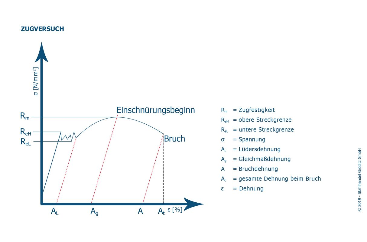 In der ISO Norm 6892 1-4 werden die unterschiedlichen Kennwerte für die Prüfverfahren festgesetzt. Dabei werden die Kennwerte für Dehnungsverhalten bei Raumtemperatur in der Norm ISO 6892-1 , bei erhöhter Temperatur in ISO 6892-2 , bei besonders tiefen Temperaturen in ISO 6892-3, bei flüssigem Helium in ISO 6892-4 festgelegt. Beim Zugversuch nach ISO 6892-1 von Metall versucht man die obere und untere Streckgrenze, die Dehngrenze, die Zugfestigkeit, die Bruchdehnung und mehr zu ermitteln. Bei besonders Zugfesten Metallen liegt die Höchstzugkraft noch über der oberen Streckgrenze. [8]