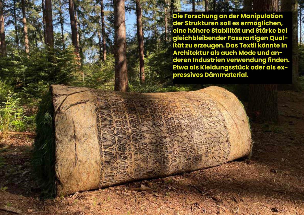Weitere Forschung an der Manipulation von Strukturen soll es ermöglichen, eine höhere Stabilität und Stärke bei gleichbleibender Faserartigen Qualität zu erzeugen. Das Textil könnte In Architektur als auch Mode und anderen Industrien Verwendung finden. Etwa als Kleidungsstück oder als expressives Dämmaterial...